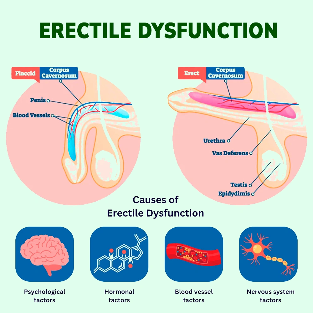• Hormonal Causes: Low levels of testosterone (hypogonadism) can reduce libido and contribute to ED.